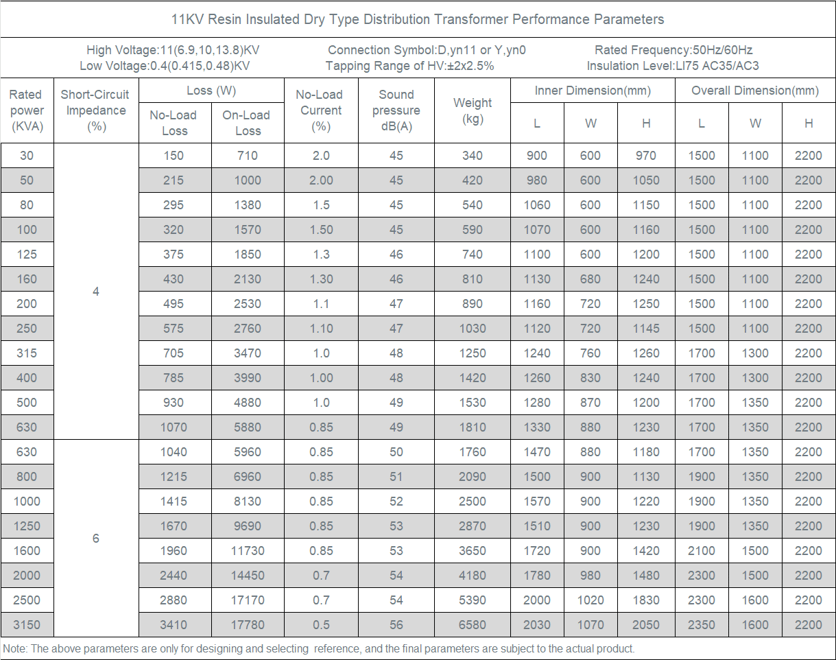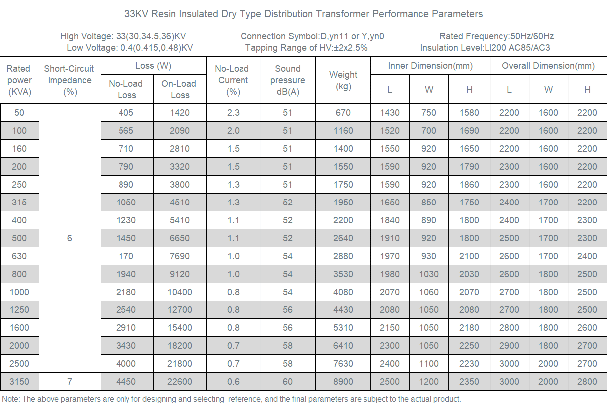 Resin insulated dry-type distribution transformer is a type of electrical transformer that does not use any liquid coolant, such as oil, for heat dissipation. Instead, it relies on air natural convection or forced air cooling for its temperature regulation. The rated capacity ranges from 30KVA to 3150KVA, and is suitable for power systems with AC 50Hz/60Hz and working voltage of 6KV~38.5KV and below. They are used as substation equipment in power transmission and distribution fields, infrastructure fields, public transportation, buildings and residences, industrial fields, information technology fields and new energy fields.
